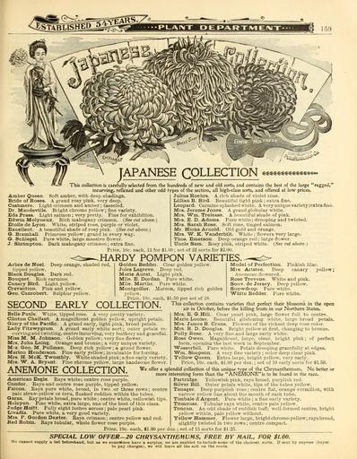 Keywords: Everything for the garden (16853122442).jpg r <br> PLAIMT DEIPARTIVIEIMT <br> 159 <br> This collection is carefully selected from the <br> incurving reflezed and other odd <br> Amber Queen Soft amber with deep shadings <br> Bride of Roses A gnind rosy pink very deep <br> Cashmere Light crimson and amber; tasseled <br> Dr Mandeville Bright chrome yellow ; fine variety <br> Eda Prass Light salmon ; very pretty Fine for exhibition <br> Edwin Molyneux Rich mahogany crimson See cut above <br> Etoile de Lyon White striped rose purple or violet <br> Excellent A beautiful shade of rosy pink See cut above <br> G BramhaU Primrose yellow ; grand in every way <br> G Schlegel Pure white large massive flower <br> J SlmmptOQ Dark mahogany crimson ; extra fine <br> Price 10c each 12 for 1 <br> J APANESE C OLLECTION <br> hundreds of new and old sorts and contains the best of the large ragged <br> types of the section all high-class sorts and offered at low prices <br> Julius Roehrs A rich shade of violet rose <br> Lillian B Bird Beautiful light pink ; extra fine <br> Leopard Carmine splashed white A very unique variety;extra fine <br> Mrs Jerome Jones A grand globular white <br> Mrs Wm Trelease A beautiful shade of pink <br> Mrs E D Adams Pure white; drooping and twisted <br> Mrs Sarah Rose Soft rose tinged salmon <br> Mr Hicks Arnold Old gold and orange <br> Mrs W K Vanderbilt White ; flowers very large <br> Thos Emerson Deep orange red ; large flower <br> Uncle Sam Rosy pink striped white See cut above <br> 00 ; set of 22 sorts for 2 00 <br> HARDY POMPON VARIETIES <br> Arbre de Noel Deep orange shaded red <br> tipped yellow <br> Black Douglas Dark red <br> Bouquet Rich carmine <br> Canary Bird Light yellow <br> Cravaction Pink and yellow <br> Gen Canrobert Sulphur yellow <br> SECOND EARLY <br> Model of Perfection <br> Mrs Aristee Deep <br> Anemone-flowered <br> Rose Trevene White and pink <br> Souv de Jersey Deep yellow <br> Snowdrop Pure white <br> White Bedder Pure white <br> Pinkish lilac <br> canary yellow ; <br> Belle Paule White tipped rose A very pretty variety <br> Clinton Chalfant A magnificent golden yellow upright petals <br> Glory of the Pacific A grand early light pink broad petals <br> Lady Fitz'wygram A grand early white sort; outer petals re- <br> curving and twisting centre incurving very feathery aad graceful <br> Miss M M Johnson Golden yellow; very fine flower <br> Mrs John Laing Orange and bronze ; a very unique variety <br> Mrs Geo M Pullman Deep rich yellow; a grand flower <br> Marion Henderson Fine early yellow; invaluable for forcing <br> Mrs H McK Twombly White shaded pink; a fine early variety <br> Mrs W A Bryant Fine chrome yellow large handsome flower <br> ANEMONE COLLECTION <br> American Eagle Rays white; centre rose purple <br> Condor Rays and centre rose purple tipped yellow <br> Falcon Rays pure white broad in two or three rows ; centre <br> pale straw-yellow or ecru flushed reddish within the tubes <br> Garza Ray petals broad pure white ; centre white yellowish tips <br> Halcyon Fine white extra large one of the best of this class <br> Judge Hoitt Fully eight inches across ; pale pearl pink <br> Livadia Pure white a very good variety <br> Mrs F Gordon Dexter Rays crimson ; centre yellow and red <br> Red Robin Rays tubular whole flower rose purple <br> Golden Bedder Clear golden yellow <br> Jules Lagreve Deep red <br> Marie Aurat Light pink <br> Mile E Dordan Pure white <br> Mile Marthe Pure white <br> Montgolfier Maroon tipped rich golden <br> yellow <br> ' Price 10c each 1 50 per set of 18 <br> C C\\ T TH'r 'T Tr lM This collection contains varieties that perfect their blossoms in the open <br> \ \ l i i I iv ll jj jj October before the killing frosts in our Northern States <br> Mrs E G HiU Clear pearl pink large flower full to centre <br> Marie Louise Beautiful glistening white large broad petals <br> Mrs James B Crane Flowers of the richest deep rose color <br> Mrs R D Douglas Bright yellow at first changing to bronze <br> Polly Rose A very fine and large early white <br> Rose Owen Magnificent large clear bi-ight pink; of perfect <br> form opening the last week in September <br> Wasserfall Pure white Petals drooping gracefully at edges <br> Wm Simpson A very fine variety; color deep clear pink <br> Yellow Queen Extra large bright yellow very early <br> Price 10c each 1 00 per doz ; set of 19 early sorts for 1 50 <br> We offer a splendid collection of this unique type of the Chrysanthemum No better or <br> more interesting form than the ANEMONE is to be found in the race <br> Partridge Yellowish pink rays broad purplish red <br> Silver Bill Outer petals white tips of the lubes yellow <br> Tauager Deep purplish rose ; centre flat orange vermilion with <br> narrow yellow line about tlie mouth of each tube <br> Timbale d' Argent Pure white ; a fine early variety <br> Titmouse Tubular rays white centre pale yellow <br> Toucan An odd shade of reddish buff; well-formed centre bright <br> yellow within pale yellow without <br> Yellow Hammer Flower large bright chrome-yellow; rays broad <br> slightly twisted in two rows ; centre compact <br> Price 10c each 1 00 per doz ; set of 15 sorts for 1 25 <br> SPECIAL LOW OFFER ” 20 CHRYSANTHEMUMS FREE BY MAIL FOR 1 00 <br> We caanot supply a list beforehand but aa we someMmes have a surplus we are enabled to include some of the choicest sorts If sent by express buyer <br> to pay charges we will leave all the soil on the roots 42383248 133997 66553 Page 159 Text http //www biodiversitylibrary org/page/42383248 1902 10 5962/bhl title 66553 Henry G Gilbert Nursery and Seed Trade Catalog Collection ; Peter Henderson Co NameFound Chrysanthemum NameConfirmed Chrysanthemum EOLID 38388 NameBankID 2657422 NameFound Julius NameConfirmed Julius NameBankID 4209283 NameFound Livadia Biodiversity Heritage Library Everything for the garden 1901 Garden Stories Catalogs Flowers Peter Henderson Co Plants Ornamental Seed industry and trade 