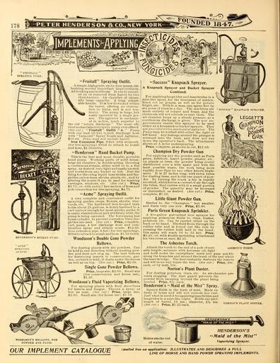 | Keywords: Everything for the garden (16853260771).jpg PETER HEN PERSON 7k GO NEW YORK- <br> llMPIiEMENTSf-APPLTING <br> HENDERSON 8 BUCKET PUMP <br> ACME <br> SPRAYING <br> Ol'THT <br> Fruitall Spraying Outfit <br> A simple high jjraiie iip-to-ilnte pump em- <br> bodying several important improvements <br> AJlworkingpartsof brass It can bemonnt- <br> ed on or removed from barrel by f no <br> tbumhscrews Air chamber of unusu- <br> ally large capacity A long adjust- <br> able handle It is low down and within <br> the barrel offering no obstruc- <br> tion to limbs and is not top- <br> heavy The pump is large but <br> easily operated by a single per- <br> son The agitator is mechanic- <br> al in action much superior to <br> the old return discharge The most efTi- <br> cientandsatisfactor vsprav pump everoffered <br> iSpe cut Fruitall Outfit A Pump <br> with one lead 10 feet li-indi discharge hose <br> with Vermorel Spra v Nozzle and Agitator <br> §10 00 Price does not iuclutle harrel <br> Iron Extension Pipe 8 feet with stopcock <br> for tree spraying fitted to attach to nozzle <br> and hose 1 50 extra <br> Henderson Hand Bucket Pump <br> This is the i est and most durnl le portable <br> hand pump Working parts of solid brass; <br> large air chamlier; is doulile-acting throwing <br> a continuous stream eitlier solid or In a fine <br> spray as desired ; very light and easily carried <br> and works from any bucket or tub Just the <br> thing for throwing liquid insecticides and fun- <br> gicides onlowtrees shrubs plants etc and by <br> altering the nozzle ft can be used for washing <br> carriages windows etc See cut Price <br> 3 7 5 ; or with extra 7 feet section of hoseaud <br> pole connection for tree spraying 4 75 <br> Acme Spraying Outfit <br> A very complete and convenient outfit for <br> spraying garden crops flowers shrubs vine- <br> yards etc The hardwood Iron-hooped tank <br> holds about 25 gallium is firmly fastened to a <br> cart narrow enougli for most garden paths; it <br> is easil v wheeled about and sits firmly while the <br> pump is being operated The force-pump has <br> brass cylinder to prevent corrosion when fun- <br> gicides are used See cut Price complete <br> cart pump 4 feet discharge hose and com- <br> bination spray and stream nozzle 12 00 <br> Iron extension pi e 8 feet for tree spraying <br> fitted to attach to nozzle and hose 1 50 extra <br> Woodason's Double Cone Powder <br> Bellows <br> For dusting plants with dry powders Can <br> be held in any direction without wasting pow- <br> der and does not clog up The best lieliows <br> for destroying insects in conservatory gar- <br> den orchard or field ; it dusts under the leaves <br> as well as on top See cut Price 3 00 <br> Single Cone Powder Bellows <br> Price largesize 2 00 Small size <br> for conservatory and house use <br> 1 25 <br> Woodason's Fluid Vaporizing Bellows <br> For spraying plants with fluid decoctions <br> for insects and fungus Throws a spray as <br> fine as mist See cut Price large size <br> 2 00 Small size tor house use 1 50 <br> tip <br> Success Knapsack Sprayer <br> A Knapsack Sprayer and Bucket Sprayer <br> Combined <br> For applyingfungiiides ami insecticides in a <br> mist-like spray for the treatment of mildew <br> black rot on grapes as well as for potato <br> blight etc With it a man can spray five to <br> six acres of vines in a day The machines are <br> made entirely of copper and brass and the <br> dicniicals will not corrode or rust them The <br> nirclmmber keeps up a steady pressure so a <br> continuous discharge is given The new iiii- <br> provenients enable this sprayer to be used <br> either as a knapsack orbucket sprayer They <br> ave provUled nitlia niecliiuiical anitntor The <br> I'uwp may be worked with either the right or <br> left hand Any leakage around the plunger is <br> returned into the tank and docs not run <br> down the operator's back The attachment <br> shown at \ Is for underspra ving <br> Price complete as shown in cut 11 00 <br> Champion Dry Powder Gun <br> For applying any dry ponder such as Paris <br> green hellebore insect powder plaster etc <br> on plants or trees the powder being evenlv <br> distributed over a wide space and with the <br> least iiossible waste the work being more <br> rapidly done than by any other known Imple- <br> ment It is 27 inches long with extra tubes <br> for dusting trees and holds one quart of pow- <br> der By turning the crank a fan is rapidly <br> revolved which forces a current of air through <br> the tubes tliat carries with it a small portion <br> of powder The quantity ma v be Increased <br> or diminished as desired See cut Price <br> complete 7 50 <br> Little Giant Powder Gun <br> Similar to the Clinmpion but Braaller <br> and dusts only one row Price 5 00 <br> Paris Green Knapsack Sprinkler <br> A five-gallon galvanized iron sprayer for <br> applying poisonous fluids to vines bushes <br> potatoes etc Can be carried either on the <br> back or by hand Thefluid flows through the <br> rubber tube and is forced out like rain by <br> pressing the rubber bulb held in the hand ; <br> this spray will R'ach 10 to 12 feet Price <br> 3 25; or with iJoubie sprinkling attachment <br> for two rows at once 4 25 <br> The Asbestos Torch <br> Attach the torcli to the end of a pole of sidt- <br> able length saturate with kerosene oil light <br> and hold under the caterpillars' nests and pass quickly <br> along the branches and around thetrunk of the tree where <br> the insects lodge The heat instantly destroys the Insects <br> and will in no way injure the tree See cut Price 40c <br> each or by mall 50c <br> Norton's Plant Duster <br> For dusting potatoes vines etc An air-chamber pre- <br> vents clogging The dust guard prevents the <br> powder from escaping beyond the plant being <br> treated Price 85c each <br> Henderson's Maid of the Mist Spray <br> Sprays fluids in the form of mist Made en- <br> tirely of brass and will not corrode nor rust