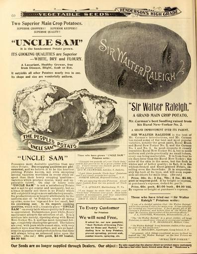 | Keywords: Everything for the garden (Page 60) (16460959319).jpg 60 <br> Two Superior Main Crop Potatoes <br> SUPERIOR CROPPERS SUPERIOR KEEPERS <br> SUPERIOR QUALITY <br> 44 <br> UNCLE SAM <br> It is the handsomest Potato grown <br> ITS COOKING QUALITIES are Superior <br> ”WHITE DRY and FLOURY <br> A Luxuriant Healthy Grower free <br> from Disease Blight Scab or Rot <br> It outyields all other Potatoes nearly two to one <br> Its shape and size are wonderfully uniform <br> UNCLE SAM <br> Possesses more desirable qualities than any <br> otlier Potato Its cropping qualities are phe- <br> nomenal and we believe it to be the heaviest <br> yielding Potato known not even excepting <br> several varieties worthless in every other re- <br> spect than their heavy cropping qualities ” <br> varieties which produce coarse waxy and un- <br> palatable tubers On clay or heavy soils <br> UNCLE SAM is not a satisfactory Potato <br> and is apt to get coarse and unshapely but on <br> a loain or sandy soil there is no Potato which <br> will outyield it or give more satisfactory results <br> Its productiveness is largely attributable to the <br> uniform size of he Potatoes nearly all sizing <br> up alike none too irge and few too small but <br> its crowning niei is its superb cooking <br> qualities which will ultimately place UNCLE <br> SAM on every table where quality in Potatoes <br> is appreciated Its handsome pure white floury <br> appearance attracts the attention of all It is a <br> medium late variety ripening along with Bural <br> New-Yorker No 2 and has most luxuriant foli- <br> age completely shading the ground The tubers <br> are oval with pure white russet skin with very <br> shallow eyes near the surface and are so hand- <br> some in appearance and perfect in form that they <br> will always bring an enhanced price upon the <br> market See cut 60c peck 2 00 bushel <br> 4 00 bbl <br> Those wtio have grown UNCLE SAM <br> Potatoes write <br> I bought ten pounds of your 'Unrle Sam ' <br> and it hus proved to he a nood yielder with <br> me I have twenty-one busliels grown ftom <br> the ten pounds of seed <br> GUY W CI \ WFOHD Letcher S Dakota <br> I got three pounds 'Unrle Sam' Potatoes <br> and I got ninety pounds Iti st spring <br> JOSEPH EDGAR Hopewell Center N Y <br> We are enjoying the nice Potatoes A bout <br> eight bushels ftom the ten pounds of 'Uucle <br> Sam ' <br> C L QUIGLEY M rtinsburg W Fa <br> / am happy to state that we like your <br> 'Uncle Sam ' Potatoes very much Their table <br> quality is unsurpassed and they outyielded <br> everv other variety we planted <br> AMOS G GIIA Y North Cambridge Afa -is <br> To Every Customer <br> for Potatoes <br> We will send Free <br> If asked for our new pamphlet <br> Best Methods of Growing Pota- <br> toes for Home and Market in- <br> cluding how to keep Potatoes <br> prevent sprouting prevent scab <br> combat Insects spraying etc <br> Sir waiter Raieioti <br> A GRAND MAIN CROP POTATO <br> Mr Carman's best Seedling raised from <br> his Rural New-Yorker No 2 <br> A GRAND IMPROVEMENT OVER ITS PARENT <br> SIR ˘WALTER RALEIGH is the best ot <br> Mr Carman's iutroduoLions and Mr Carman <br> has raised some of the best and most popular <br> varieties notably the great pairs Eural Blush <br> and Rural New-Yorker No 2 and the Carman <br> No 1 and No 3 In most respects it closely <br> resembles Rural New-Yorker No 2 but Is more <br> uniform and yields practically no small tubers <br> every one being marketable It is from four to <br> six days later than the Rural New-Yorker; the <br> color of the skin is the same but the flesh is <br> whiter and of better quality ; in fact it is the <br> whitest-fleshed and finest-grained Potato ex- <br> celling even the Snowflake It is unquestlon- <br> ably the best of its type and will soon super- <br> sede all others for main crop See cut <br> Price 30c lb ; 3 lbs 70c ; 5 lbs 1 00 <br> post or express paid If by freight or express <br> at purchaser's expense deduct 8c per lb <br> Price 60c peck 2 00 bush 4 00 bbl <br> By express or freight at purchaser's expense <br> Those who have tried our Sir Walter <br> Raleigh Potatoes write <br> – – / am of a decided opinion that 'Sir Walter Raleigh' <br> will he the coming Potato for main crop It has certainly <br> far exceeded my expectations I have grown all of Mr <br> Carman's Potatoes and believe that in ' Sir Walter Ra- <br> leigh' Mr Carman has excelled all his previous elTorts <br> J L COXOVER Wickatunk Monmouth Co N J <br> The 'Sir Walter Raleigh' is a great yielder; all large <br> Potatoes no small ones; vines grow strong and upright <br> C W BEARDSLEY Milford Conn <br> 'Sir Walter Raleigh ' is an immense yielder offine qual- <br> ity and very few small ones <br> S O BENJAMIN Aquehogue Long Island S Y <br> it present ALL things considered we are inclined to <br> regard the 'Sir Walter Raleigh' as the best Potato we <br> have ever tried <br> RURAL NEW-YORKER <br> Our Seeds are no longer supplied through Dealers Our object L°haVc ÂŁa';t h e;' ots\td rtSe' 42383101 133997 66553 Page 60 Text http //www biodiversitylibrary org/page/42383101 1902 10 5962/bhl title 66553 Henry G Gilbert Nursery and Seed Trade Catalog Collection ; Peter Henderson Co NameFound Floury NameConfirmed Floury Baker NameBankID 1455272 Biodiversity Heritage Library Garden Stories Catalogs Flowers Peter Henderson Co Plants Ornamental Seed industry and trade Seeds Trade catalogs Vegetables U S Department of Agriculture National Agricultural Library bhl page 42383101 dc identifier http //biodiversitylibrary org/page/42383101 BHLinbloom peter henderson co plants ornamental u s department of agriculture national agricultural library bhlinbloom Information field Flickr posted date ISOdate 2015-02-25 PD-old-70-1923 Everything for the garden 1902 Photos uploaded from Flickr by Fæ using a script Files from the Biodiversity Heritage Library released as Attribution-NonCommercial-ShareAlike |