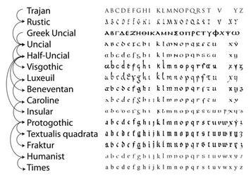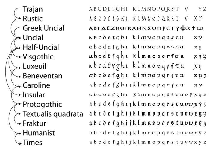Keywords: Evolution of minuscule.svg en Evolution of minuscule based on several sources but mainly for convenience from a calligraphy book <ref>David Harris The Calligrapher's Bible 100 Complete Alphabets and How to Draw Them 2003</ref> but corrected the various incorrect forms j v and w removed z and s changed <ref>http //medievalwriting 50megs com/scripts/letters/letters htm letterindex</ref> own Squidonius References Reflist ImageNote 1 291 73 2377 106 2758 1970 2 capitalis monumentalis Roman square capitals as found in the inscriptions on the Trajan Column in Rome also see ImageNoteEnd 1 ImageNote 2 284 308 2364 356 2758 1970 2 Uncial Category Uncial Category Semi-uncial ImageNoteEnd 2 ImageNote 3 291 925 2364 112 2758 1970 2 Beneventan hand ImageNoteEnd 3 ImageNote 4 291 1173 2364 106 2758 1970 2 Insular and Gaelic hands ImageNoteEnd 4 ImageNote 5 291 1045 2334 121 2758 1970 2 Carolingian minuscule developed under the reign of Charlemagne ImageNoteEnd 5 ImageNote 6 284 1418 2351 112 2758 1970 2 Category Textura ImageNoteEnd 6 ImageNote 7 284 1543 2364 125 2758 1970 2 Fraktur Category Fraktur ImageNoteEnd 7 ImageNote 8 287 1293 2344 119 2758 1970 2 Category Gothic minuscule ImageNoteEnd 8 Handwriting Medieval scripts Historical development of letters |