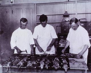 Keywords: Examining Rats for Bubonic Plague New Olreans 1914 a024245.jpg Examining rats for bubonic plague in New Orleans Photo of three men dissecting rats Notes The plague was detected in rats at the Port of New Orleans in 1914 prompting a major rat eradication effort Via http //ihm nlm nih gov/images/A24245 1914 Photographer not credited PD-USGov 1914 in New Orleans Dead rats Veterinary autopsies Men at work in New Orleans Plague Rodent control Rat dissection 1914 photographs |