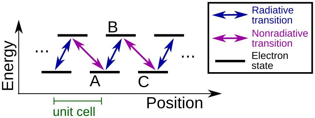 | Keywords: ExampleOfBulkPhotovoltaicEffect.svg en An example of a simple system that would exhibit the bulk photovoltaic effect There are two electronic levels per unit cell separated by a large energy gap say 3eV The blue arrows indicate radiative transitions i e an electron can absorb a UV photon to go from A to B or it can emit a UV photon to go from B to A The purple arrows indicate nonradiative transitions i e an electron can go from B to C by emitting many phonons or can go from C to B by absorbing many phonons When light is shining an electron will occasionally move right by absorbing a photon and going from A to B to C However it will almost never move in the reverse direction C to B to A because the transition from C to B requires an improbably large thermal fluctuation Therefore there is a net rightward photocurrent 2014-01-03 13 33 29 own Sbyrnes321 cc-zero Uploaded with UploadWizard Photovoltaics Semiconductor physics Semiconductor band diagrams |