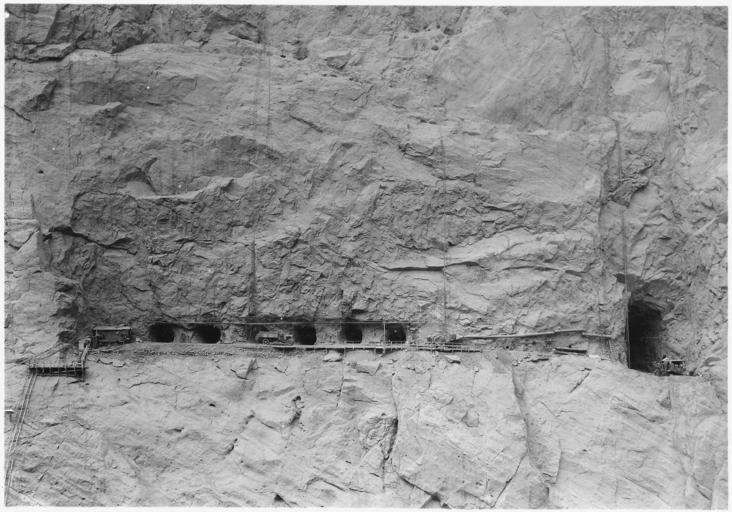 | Keywords: Excavation for Nevada canyon wall outlet works and conduits. View looks directly against canyon wall and shows the... - NARA - 293798.jpg Scope and content Photograph from Volume Two of a series of photo albums documenting the construction of Hoover Dam Boulder City Nevada General notes 293798 Local identifier Department of the Interior Bureau of Reclamation Engineering and Research Center 05/18/1981 - 03/04/1988 NARA's Rocky Mountain Region Denver NRGA Building 48 Denver Federal Center West 6th Avenue and Kipling Street Denver CO 80225-0307 1933-02-10 Record group Record Group 115 Records of the Bureau of Reclamation 1889 - 2008 Record group ARC 444 Photograph albums compiled 1903 - 1972 Series ARC 293611 File unit File unit ARC Variant control numbers NAIL Control Number NRG-115-CONSTPHO85006-BC21526 Other versions <gallery> File Excavation_for_Nevada_canyon_wall_outlet_works_and_conduits _View_looks_directly_against_canyon_wall_and_shows_the _-_NARA_-_293798 tif tif </gallery> NARA-cooperation PD-USGov Construction of the Hoover Dam 1933 in the United States Adits in the United States |