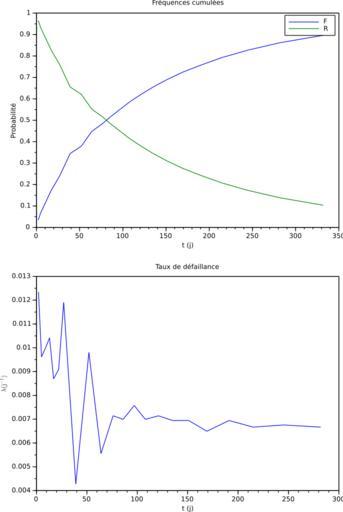 | Keywords: Exemple fiabilite F R lambda.svg fr Exemple d'étude de fiabilité tracé des fonctions de mortalité F de survie R et du taux de défaillance λ Obtenu avec Scilab modifié avec Inkscape en Example of reliability study plotting of the lifteime function F survival function R and hazard function λ Made with Scilab modified with Inkscape 2013-06-24 14 00 59 own Cdang cdang Scilab source <source lang scilab > // Ce script nécessite le module Atoms CASCI clear; /// // génération des données // // Données originales paramètres de la loi de Weibull // beta_forme 0 845; // eta_echelle 126; // Y linspace 0 1 30 // Y Y 2 -1 ; // t_orig floor idfweibull Y beta_forme eta_echelle '; t 2 5 9 13 17 22 27 39 39 39 52 64 64 76 86 97 108 121 135 151 169 191 215 245 282 332'; t_complet t ; 365 ; 365; N 28 Ncomplet size t_complet ; // nombre cumulé i 1; j 1 n0 1; nt size t ; while i < nt if t i <>t i+1 then dn j n0; n0 1; tt j t i ; j j + 1; else n0 n0 + 1; end i i+1; end dn j n0; tt j t i ; ndn j; n 1 dn 1 ; for i 2 ndn n i n i-1 + dn i ; end // Fréquences cumulées F n/ N+1 ; R 1-F; // loi de Fisher et intervalles de confiance indices 1 ndn; nu1inf 2 Ncomplet - indices +1 ; nu2inf 2 indices; for i indices fisherinf i idffisher 0 95 nu1inf i nu2inf i ; end Finf indices' / indices' + Ncomplet - indices' + 1 fisherinf ; nu1sup 2 indices + 1 ; nu2sup 2 Ncomplet - indices ; for i indices fishersup i idffisher 0 95 nu1sup i nu2sup i ; end Fsup indices' + 1 fishersup / indices' + Ncomplet - indices' + 1 fishersup ; Rsup 1-Finf; Rinf 1-Fsup; // taux de defaillance lambda for i 1 ndn-1 tauxdef i dn i+1 / N - n i / tt i + 1 - tt i ; end MTTF mean t_complet ; // // Tracé // scf 0 ; clf; subplot 2 1 1 plot tt F R xtitle Fréquences cumulées t j Probabilité legend F R subplot 2 1 2 plot tt 1 -1 tauxdef xtitle Taux de défaillance t j \lambda \mathrm j -1 scf 1 ; clf; subplot 2 1 1 plot tt Finf -- tt Fsup -- tt F ; xtitle Courbe de mortalité t j Fréquence cumulée legend min max F 2 a1 gca ; a1 data_bounds 0 0;365 1; a1 auto_scale off ; a1 tight_limits on ; subplot 2 1 2 plot tt Rinf -- tt Rsup -- tt R ; xtitle Courbe de survie fiabilité t j Fréquence cumulée legend min max R a2 gca ; a2 data_bounds 0 0;365 1; a2 auto_scale off ; a2 tight_limits on ; </source> cc-zero Uploaded with UploadWizard Reliability |