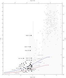 | Keywords: Exoplanet Mass-Radius Scatter Super-Earth.png black transiting Super-Earths black dots 1px solid black compared with those of white Solar System planets gray circles and 1px solid cdcdcd dadada other transiting exoplanets gray dots 1px solid dadada along with fbfbfb the distribution n light gray bar chart of minimum masses see important note below of transiting and non-transiting exoplanets 1px solid white detected through 2014-04-19 Scales indicate log<sub>10</sub> of planetary mass m expressed as Earth masses bottom and Jupiter masses top ; planetary radius r expressed in Earth radii left and Jupiter radii right ; and counts n gray ticks on right References lines are provided for approximate mass-radius relationships<ref name planetmodels > cite journal Seager S M Kuchner C A Hier-Majumder and B Militzer 2007 Mass-radius relationships for solid exoplanets The Astrophysical Journal 669 1279-1297 http //www iop org/EJ/abstract/0004-637X/669/2/1279/ 10 1086/521346 2014-04-18 </ref> for selected planetary compositions H<sub>2</sub>O - hypothetical pure water ice planet; any planet above this line has a significant H/He envelope; 1px solid blue 75 H<sub>2</sub>O + 3 Fe; 22 MgSiO<sub>3</sub> - water world; 1px dotted blue 67 Fe + 32 5 MgSiO<sub>3</sub> - rocky terrestrial; 1px dashed 808080 Fe - hypothetical pure iron planet exoplanets below this line are not likely 1px solid red Exoplanet data is from the Open Exoplanet Catalogue <ref> cite web http //www openexoplanetcatalogue com Open Exoplanet Catalogue 2014-04-19 2014-04-19 </ref> version https //github com/hannorein/open_exoplanet_catalogue/tree/4945b99b43dbd34703a66d74e1b325325c7d3d2a/systems 4945b99 The figure shows all planets up to 10 M<sub>J</sub> omitting 59 more massive planets and transiting planets up to 18 R<sub>E</sub> omitting an additional 17 with m ‰¤ 10 M<sub>J</sub> but r > 18 R<sub>E</sub> PSR B1257+12 b with m < 10<sup>-4</sup> M<sub>J</sub> lies off to the left of the graph and is also omitted Important note This figure is intended to serve as a catalog of generally accepted candidate exoplanets using the distribution of some of their basic properties related to detection No attempt has been made to characterize the degree of confidence which varies widely in the existence of a given planet or its properties Nor is any attempt made to convey systematic errors associated with a particular method In particular the indicated mass m for an exoplanet characterized using radial velocity is the minimum mass so that the actual distribution of masses for non-transiting planets may be shifted and smeared significantly to the right <references/> Own User Aldaron/Credit false true 2014-04-25 Related graphs <gallery> File Exoplanet_Discovery_Methods_Bar png Exoplanet discoveries by year; color-coded by discovery method File Exoplanet Period-Mass Scatter png Scatter plot of exoplanet period and mass data; color-coded by discovery method </gallery> Astronomy plots Astronomy cluster diagrams Astrobiology Language-neutral diagrams Exoplanet diagrams Scatterplots Super-Earths |