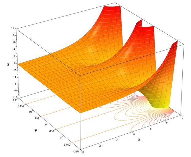 Keywords: Exponential Function (Real Part).png Diagram of the real part of exponential function in the complex plane The surface is given by <math>z \operatorname Re \left \exp \left x + i y \right \right </math> Own drawing Plotted in MuPAD 2007-04-20 Inductiveload MuPAD Code <pre> q Re exp x+I y conts 21 projectionlevel -10 ylimit 2 PI xlimit 3 submeshlevel 4 approx 20 colourfunc zip RGB Red RGB Yellow a b -> q x y +10 / 12 a - q x y -10 / 20 b funcplot plot Function3d q x y x -xlimit xlimit y -ylimit ylimit Mesh 23 23 Submesh submeshlevel submeshlevel LineColor RGB Black 0 4 LineWidth 0 15 FillColorFunction colourfunc AxesTitleFont Courier New Bold 14 ViewingBoxZRange -10 10 contours plot modify funcplot ZContours Automatic conts LineWidth 0 2 LineColor RGB Gray90 0 5 XLinesVisible FALSE YLinesVisible FALSE Filled FALSE projcontours plot Transform3d 0 0 projectionlevel 1 0 0 0 1 0 0 0 0 plot modify funcplot ZContours Automatic conts LineWidth 0 2 LineColorType Dichromatic LineColor RGB Red 0 99 LineColor2 RGB Yellow 0 99 XLinesVisible FALSE YLinesVisible FALSE Filled FALSE camera plot Camera -25 -80 120 -0 5 -1 0 0 15 ploteverything plot Canvas funcplot contours projcontours Width 8 5 unit inch Height 7 unit inch camera plot ploteverything </pre> MuPad diagrams Surface plots of complex exponential function |