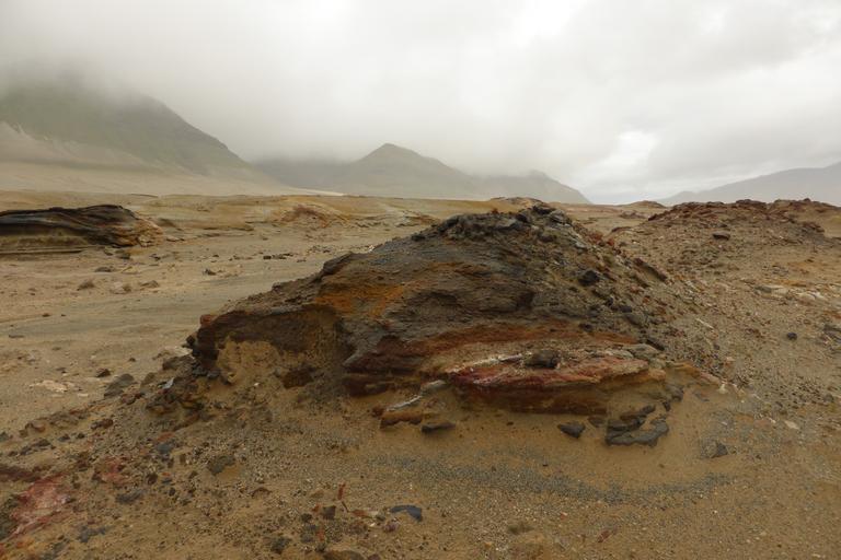 | Keywords: valley of ten thousand smokes valleyoftenthousandsmokes outdoor landscape rock The Valley is covered with mineral deposits that mark the location of extinct fumaroles. Black staining around these spots typically reflect magnetite or hematite. White zones may be enriched in silica and clay minerals. Orange to yellow staining indicates minerals such as limonite, geothite, or sulfur. NPS photo by M. Fitz. The Valley is covered with mineral deposits that mark the location of extinct fumaroles. Black staining around these spots typically reflect magnetite or hematite. White zones may be enriched in silica and clay minerals. Orange to yellow staining indicates minerals such as limonite, geothite, or sulfur. NPS photo by M. Fitz. |