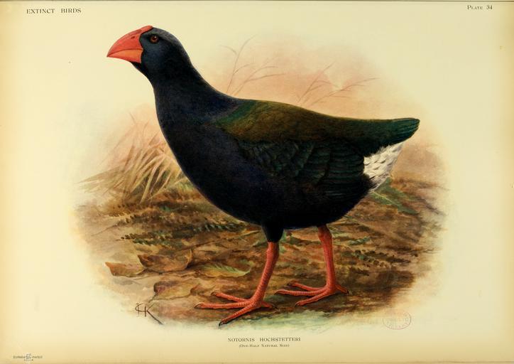 | Keywords: Extinctbirds1907 P34 Notornis hochstetteri0359.png en The TakahÄ“ or South Island TakahÄ“ Porphyrio hochstetteri is a flightless bird indigenous to New Zealand and belonging to the rail family It was thought to be extinct after the last four known specimens were taken in 1898 However after a carefully planned search effort the bird was rediscovered by Geoffrey Orbell near Lake Te Anau in the Murchison Mountains South Island on November 20 1948 Extinct birds an attempt to unite in one volume a short account of those birds which have become extinct in historical times that is within the last six or seven hundred years to which are added a few which still exist but are on the verge of extinction By Lionel Walter Rothschild 2nd Baron Rothschild 8 February 1868 “ 27 August 1937 http //www archive org/details/extinctbirdsatte00roth Creator John Gerrard Keulemans 1907 Not in copyright Public Domain Original PD-old-100 Extinct Birds Rothschild book 34 John Gerrard Keulemans Porphyrio hochstetteri illustrations |