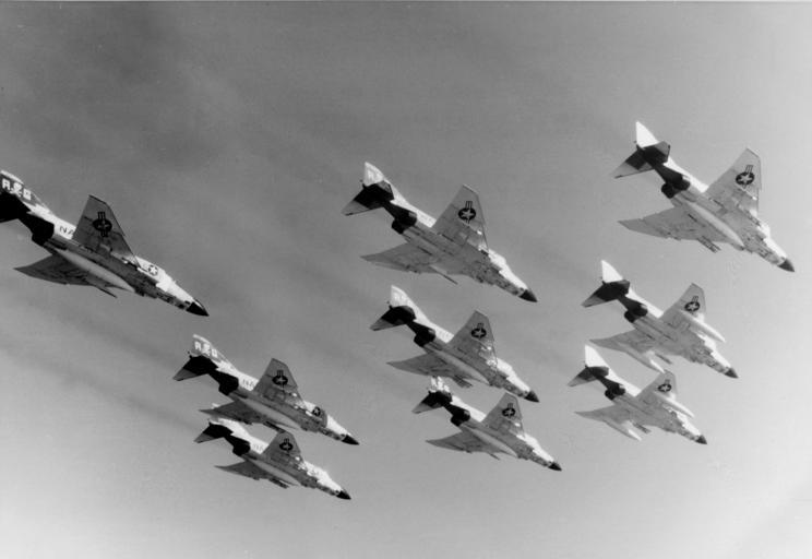 | Keywords: F-4J Phantom II of VF-84 in flight near NAS Oceana c1968.jpg Nine U S Navy McDonnell F-4J Phantom II of Fighter Squadron 84 VF-84 Jolly Rogers fly in formation near Naval Air Station Oceana Virginia USA VF-84 was assigned to Attack Carrier Air Wing 7 CVW-7 aboard the aircraft carrier USS Independence CVA-62 for a deployment to the Mediterranean Sea from 30 April 1968 to 27 January 1969 Official U S Navy photo http //www history navy mil/our-collections/photography/numerical-list-of-images/nara-series/usn/usn-47000/k-47968-f-4b-phantom-ii-in-formation html K 47968 from the U S Navy http //www history navy mil Naval History and Heritage Command ca 1968 U S Navy PD-USGov-Military-Navy F-4J Phantom II Fighter Squadron 84 United States Navy |