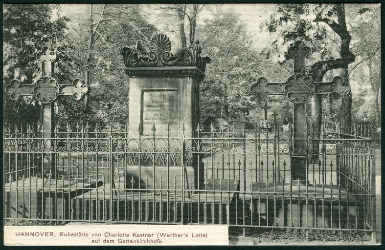 Keywords: F. Astholz jun. AK 0756 Hannover, Ruhestätte von Charlotte Kestner (Werther's Lotte) auf dem Gartenkirchhofe, Bildseite Einfriedung Maria Ernestine Charlotte Laves, Georg Wilhelm Carl Theodor Kestner.jpg Im Lichtdruck-Verfahren reproduzierte Aufnahme als fortlaufend nummerierte Ansichtskarte Nummer 756 von Friedrich Astholz junior siehe die Rückseite der Postkarte Zu sehen ist eine Frontal-Ansicht um 1900 mit dem Grabmal von Charlotte Kestner in der Bildmitte eingerahmt von den eisernen Grabkreuzen ihrer Urenkelin Maria Ernestine Charlotte Laves links und ihres Enkels Georg Wilhelm Carl Theodor Kestner Auditor bey Königl Justizkanzlei Hannover Die Grabstätten sind hier noch mit einem heute nicht mehr vorhandenen Eisenzaun umfriedet Im Hintergrund sind weitere Grabkreuze zu erkennen sowie eine auf einer Parkbank sitzende Dame Dieses Dokument wurde freundlicherweise von Heralde Schmitt-Ulms zum Scannen geliehen um es als Digitalisat bei Commons nachhaltig allen Menschen zu Bildungszwecken zur Verfügung zu stellen Scan vom Original Bernd Schwabe in Hannover ~ 1900 Friedrich Astholz junior <gallery> File F Astholz jun AK 0756 Hannover Ruhestätte von Charlotte Kestner Werther's Lotte auf dem Gartenkirchhofe Adresseite der Postkarte sogenannte geteilte Rückseite jpg Adressseite sogenannte geteilte Rückseite der fortlaufend nummerierten Ansichtskarte Nr 756 mit Verlagsangaben </gallery> PD-old Documents by Heralde Schmitt-Ulms Friedrich Astholz junior Grabmal Charlotte Kestner Georg Ludwig Friedrich Laves |