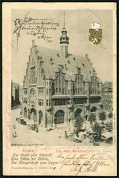 Keywords: F. Astholz jun. AK 0000 1899 Linden. Das neue Rathaus. Zusgest. Carl Arend, Verlag Hermann Ellermann, Bildseite.jpg Nicht fortlaufend nummerierte im žVerlag von H Ellermann Linden als Lichtdruck und Ansichtskarte reproduzierte Aufnahme des in Hannover tätigen Fotografen Friedrich Astholz junior Unter dem rot gedruckten Titel Zitat Linden Das neue Rathaus findet sich der Spruch Der Stadt zum Schmuck / Eine Stätte der Arbeit / Der Bürgerschaft zum Segen Darunter der Hinweis mit einer handschriftlichen Korrektur auf die Grundsteinlegung 8 October 1897 Während auf dem Vordruck oben links sich mit einer offensichtlich nachträglich handschriftlich aufgebrachten Zierschrift der Hinweis findet auf die Karte zur Einweihung des neuen Rathauses in Linden 5 Oktober 1899 wird unten rechts neben dem Bild auf die Fertigstellung des Gebäudes durch den Lindener Architekten Carl Arend hingewiesen Die Aufnahme zeigt vor dem Neubau ist das Treiben auf dem Lindener Marktplatz während auf der Schauseite des Rathauses zwei mit Pferden angespannte Kutschen auf spätere Dienste warten Oben rechts auf der Karte ist das goldfarben erhabene geprägte Wappen der Stadt Linden vorgedruckt; die leichte Beschädigung machte die Karte für den Sammlermarkt erheblich preisgünstiger Möglicherweise handelt es sich bei der nicht nummerierten Ansichtskarte und im Verlag der Buchhandlung Hermann Ellermann erschienenen Karte um eine der frühesten bekannten Ansichtskarten aus dem Werk des Fotografen Friedrich Astholz junior der später mehr als 1000 fortlaufend nummerierte Ansichtskarten vor allem mit Ansichten aus Hannover produzierte Das hier gezeigte Stück wurde von mehreren Personen mit Grüßen versehen an den auf der umseiten Adressseite genannten Joh Hüther in Hildesheim siehe unten Scan vom Original Bernd Schwabe 1899 Friedrich Astholz junior <gallery> F Astholz jun AK 0000 1899 Linden Das neue Rathaus Zusgest Carl Arend Verlag Hermann Ellermann Adressseite Adressseite an Joh Hüther in Hildesheim Tiefe Straße 10j </gallery> Hermann Ellermann Verlag Friedrich Astholz junior Neues Lindener Rathaus Hannover Market-women Horses in Hannover 1899 in Hannover 1899 documents Tiefe Straße Hildesheim Postcards of Germany PD-old |