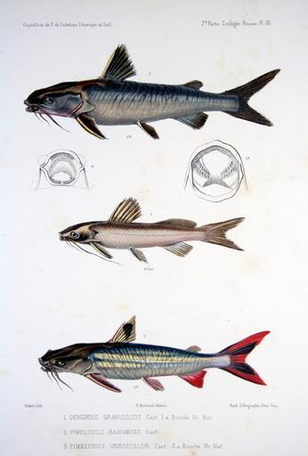 Keywords: F de Castelnau-poissonsPl16.jpg From top to bottom <br/> Pimelodus versicolor Genidens barbus 3a mouth <br/> Pimelodus bahianus Pimelodella bahianus <br/> Genidens granulosus Genidens genidens 1a mouth <br/> fr Expédition dans les parties centrales de l'Amérique du Sud de Rio de Janeiro à Lima et de Lima au Para sous la direction du Comte Francis de Castelnau 1856 exemplaire de la bibliothèque patrimoniale de Gray France Scanned by Jeffdelonge Creator Francis de Laporte de Castelnau 1856 Genidens barbus jpg PD-old-100 Francis de Castelnau's expedition Fish of South America Genidens barbus Genidens genidens |