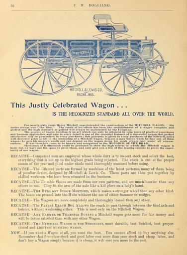| Keywords: F. W. Bolgiano, seedsmen have won confidence for ten years (16187845927).jpg 3C <br> V \\' BOLGIANO <br> This Justly Celebrated Wagon <br> IS THE RECOGNIZED STANDARD ALL OVER THE WORLD <br> For nearly sixty years Henry Mitchell superintended tlie construction of tlie MITCHEL L WAGON His <br> motto always was The Best The result of his eftbrts has 1i een the establishment of a wagon complete and <br> perfect and the high standard so gained will always be maintained by the Company <br> The process of wag-on building is an art vhich can only be attained by long years of practical experience <br> and business application and care in every detail is one of the essential features of a successful wagon that perfect <br> satisfaction may be guaranteed to every purchaser; this guaranty is given to every purchaser of the Mitcht-ll and a <br> well deserved pride is felt in the ownership of a Mitchell wagon beacuse a man knows when he has one of these <br> vagons he gets his money's Avorth and can depend on the Avagon doing his Avork always and under all circum- <br> stances It has therefore come to be known and recognized as the MONARCH OF THE RO \D <br> Thousands of testimonials could be produced to shoAv the high esteem in which the Mitchell wagon is <br> held but we have not the space to print them and only give you a few of the leading reasons to prove the super- <br> iority of our wagon <br> BECAUSE CompeteDt men are employed whose whole duty is to inspect stock and select the best <br> everything that is not up to the highest grade being rejected The stock is cut at the proper <br> season of the year and piled under sheds until thoroughly seasoned before using <br> BECAUSE The different parts are formed by machines of the latest patterns many of them being <br> of peculiar device designed by Mitchell Lewis Co These parts are then put together by <br> skilled workmen who have been educated in the business <br> BECAUSE The Thimble Skeins are made from our own patterns and are much heavier than any <br> others in use They fit the arm of the axle like a kid glove on a lady's hand <br> BECAUSE The Hubs are Dodge Mortised which makes a stronger wheel than any other kind <br> The boxes are pressed into the Hubs without the use of either hammer or wedges <br> BECAUSE The Wagons are more completely and thoroughly ironed than any other <br> BECAUSE The Patent Reach Box Allows the reach to pass through between the hind axle and <br> bolster without weakening either This is used only on the Mitchell Wagon <br> BECAUSE Any Farmer or Teamster Buying a Mitchell wagon gets more for his money and <br> will be better satisfied than with any other Wagon <br> BECAUSE The Mitchell Wagon is the Strongest most durable best finished best propor- <br> tioned and lightest running wagon <br> NOW If you want a Wagon at all you want the best You cannot afford to buy anything else <br> Remember that first-class stock and good labor cost more than poor stock and cheap labor and <br> don't buy a Wagon simply because it is cheap it will cost you more in the end 42158394 132780 65933 Page 36 Text http //www biodiversitylibrary org/page/42158394 1899 10 5962/bhl title 65933 F W Bolgiano Co ; Henry G Gilbert Nursery and Seed Trade Catalog Collection Biodiversity Heritage Library F W Bolgiano seedsmen have won confidence for ten years Garden Stories Bulbs Plants Catalogs Fruit Garden tools Nurseries Horticulture Seeds Vegetables U S Department of Agriculture National Agricultural Library bhl page 42158394 dc identifier http //biodiversitylibrary org/page/42158394 bhlGardenStories BHLinbloom bulbs plants nurseries horticulture u s department of agriculture national agricultural library bhlgardenstories bhlinbloom Information field Flickr posted date ISOdate 2015-01-26 Check categories 2015 August 24 CC-BY-2 0 BioDivLibrary https //flickr com/photos/61021753 N02/16187845927 2015-08-24 07 52 09 cc-by-2 0 PD-old-70-1923 F W Bolgiano seedsmen have won confidence for ten years Photos uploaded from Flickr by FĂŚ using a script |