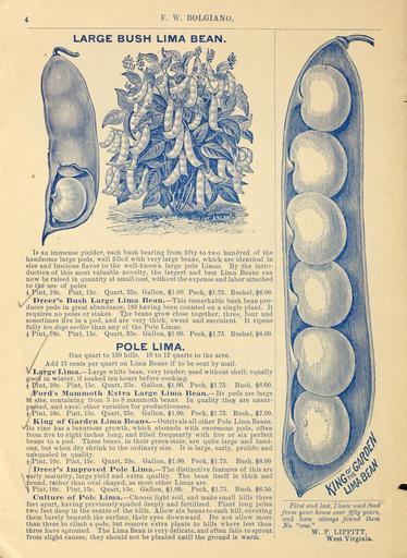 Keywords: F. W. Bolgiano, seedsmen have won confidence for ten years (16187773737).jpg V W BOLGIANU <br> LARGE BUSH LIMA BEAN <br> Is an immense yielder each bush bearing from fifty to two hundred of the <br> handsome large pods well filled with very large beans which are identical in <br> size and luscious flavor to the well-known large pole Limas By the intro- <br> duction of this most valuable novelty the largest and best Lima Beans can <br> now be raised in quantity at small cost without the expense and labor attached <br> to the use of poles <br> ij mt 10c Pint 15c Quart 25c Gallon 1 00 Peck 1 75 Bushel 6 00 <br> Dreer's Busli Large Lima Bean This remarkable bush bean pro- <br> duces pods in great abundance 185 having been counted on a single plant It <br> requires no poles or stakes T he beans grow close together three four and <br> sometimes five in a pod and are very thick sweet and succulent It ripens <br> fully ten days earlier than any of the Pole Limas <br> iPint lOc Pint 15c Quart 25c Gallon 1 00 Peck 1 75 Bushel 6 00 <br> POLE LIMA <br> One quart to 150 hills 10 to 12 quarts to the acre <br> Add 15 cents per quart on Lima Beans if to be sent by mail <br> LaTge Lima Large white bean very tender; used without shell; equally <br> goo i in winter if soaked ten hours before cooking <br> i Fmt 10c Pint 15c Quart 25c Gallon 1 00 Peck 1 75 Bush 6 00 <br> Ford's Mammoth Extra Large Lima Bean Its pods are large <br> in size containing from 5 to 8 mammoth beans In quality the y are unsur- <br> passed and excel other varieties for productiveness <br> i 'Pint 10c Pint 15c Quart 25c Gallon 1 00 Peck 1 75 Bush 7 00 <br> King of Garden Lima Beans Outrivals all other Pole Lima Beans <br> ts vine has a luxurious growth which abounds with enormous pods often <br> from five to eight inches long and filled frequently with five or six perfect <br> beans to a pod These beans in their green state are quite large and lusci- <br> ous but when dry shrink to the ordinary size It is large early prolific and <br> unequaled in quality <br> i-Pint 10c Pint 15c Quart 25c Gallon 1 00 Peck 1 75 Bush 6 00 <br> ; Dreer's Improved Pole Lima The distinctive features of this are <br> \ tfarly maturity large yield and extra quality The bean itself is thick and <br> Xfound rather than oval shaped as most other Limas are <br> Pint 10c Pint 15c Quart ' 5c Gallon 1 00 Peck 1 75 Bush 6 50 <br> Culture of Pole Lima Choose light soil and make small hills three <br> feet apart having previously spaded deeply and fertilized Plant long poles <br> two feet deep in the centre of the hills Allow six beans to each hill covering <br> them barely beneath the surface their eyes downward Do not allow more <br> than three to climb a pole but remove extra plants to hills where less than <br> three have sprouted The Lima Bean is very delicate and often fails to sprout <br> from slight causes; they should not be planted until the ground is warm <br> 7 <br> ' il l <br> il ir l <br> First and last Ihave 2 sed Seed <br> from your house over fifty years <br> and have always found them <br> No ' 7»e <br> W F LIPPITT <br> West Virginia 42158362 132780 65933 Page 4 Text http //www biodiversitylibrary org/page/42158362 1899 10 5962/bhl title 65933 F W Bolgiano Co ; Henry G Gilbert Nursery and Seed Trade Catalog Collection NameFound Limas NameConfirmed Limas NameBankID 4220815 Biodiversity Heritage Library F W Bolgiano seedsmen have won confidence for ten years Garden Stories Bulbs Plants Catalogs Fruit Garden tools Nurseries Horticulture Seeds Vegetables U S Department of Agriculture National Agricultural Library bhl page 42158362 dc identifier http //biodiversitylibrary org/page/42158362 bhlGardenStories BHLinbloom bulbs plants nurseries horticulture u s department of agriculture national agricultural library bhlgardenstories bhlinbloom Information field Flickr posted date ISOdate 2015-01-26 Check categories 2015 August 24 CC-BY-2 0 BioDivLibrary https //flickr com/photos/61021753 N02/16187773737 2015-08-24 07 54 58 cc-by-2 0 PD-old-70-1923 F W Bolgiano seedsmen have won confidence for ten years Photos uploaded from Flickr by FÊ using a script |