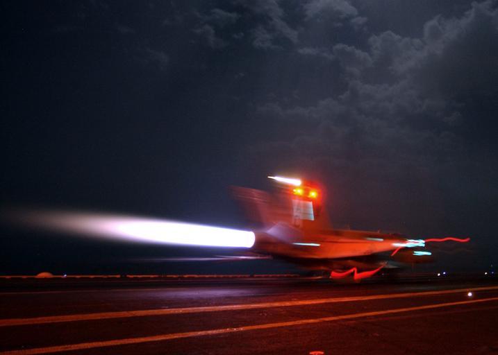 Keywords: FA-18-Afterburners.jpg An F/A-18A Hornet assigned to the Silver Eagles of Marine Fighter Attack Squadron One One Five VMFA-115 lights its afterburners to maintain full military power immediately following a night arrested landing aboard the Nimitz-class aircraft carrier USS Harry S Truman CVN 75 http //www navy mil/view_image asp id 19230 2004-11-26 U S Navy photo by Photographer ™s Mate Airman Kristopher Wilson PD-USGov-Military-Navy F/A-18A Hornet on flight decks Aboard USS Harry S Truman CVN-75 Aircraft using afterburning Taken with Nikon D1X Military activities at night F/A-18 Hornet aircraft carrier landings |