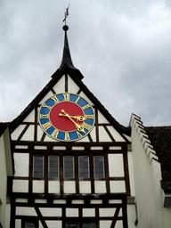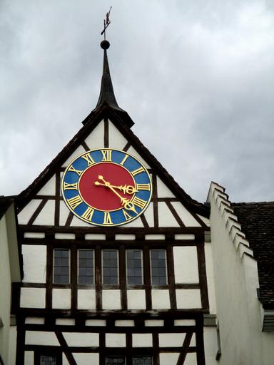 Keywords: fachwerkhaus old town tower time indicating clock face facade stufendach window stein am rhein schaffhausen switzerland
