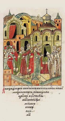 Keywords: Facial Chronicle - b.09, p.095 - Wedding of Ivan Mikhailovich of Tver and Maria Keystutovna.jpg ЛИЦЕВОЙ ЛЕТОПИС ЫЙ СВОД А на следующий день обвенчан был князь Иван ихайлович в собо ной це кви святого Спаса владыкою Евфимием Тве ским http //sterligoff ru/ century 16 anonymous PD-Old Facial Chronicle v 6 - Ostermanovskiy 1-y tom 1254-1378 Files uploaded by Shakko from various sources Ivan Mikhailovich of Tver in miniature Maria of Lithuania 1404 1374 in Russia Weddings in medieval manuscripts Russia