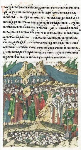 | Keywords: Facial Chronicle - b.09, p.531 - Entombment of Kulikovo.jpg ru Лицевой летописный свод Тогда князь великий Длящий Иванович сказал «Сосчитайте б атья сколько осталось всех нас» И сосчитали и сказал ихайло Александ ович московский боя ин «Господине княже осталось всех нас 40000 а было всех больше четы ехсот тысяч и конной и пешей ати» Сказал князь великий «Воля Господня да будет Как угодно было Господу так и стало Ибо воле Его кто восп отивится Или кто ечет п отив Господа Его волею и хотением все уст ояется» http //www akteon-elib ru/LITsIeVOI-LIeTOPISNYI-SVOD-Russkaya-letopisnaya-istoriya-Kniga-9/ 464 century 16 anonymous PD-Old Facial Chronicle v 7 - Ostermanovskiy 2-y tom 1378-1424 Death in medieval miniatures Russia Files uploaded by Shakko from various sources Battle of Kulikovo in manuscripts Funerals in Russian art |