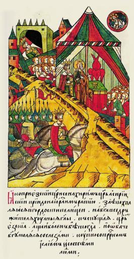 | Keywords: Facial Chronicle - b.11, p.305 - Hezekiah.gif Также было и п и ца е Иезекии когда Сенахи им ца ь Асси ийский пошел войной на Ие усалим зло похваляясь в го - дыне великой и на Бога Вседе жителя богохульные слова из- екал Ца ь же Иезе- кия хотя и болен был тогда но однако Богу молился со слезами вместе с п о оком Исайей и со всеми людьми И услышал Бог молитву их и в ту же ночь ангел Господень по- губил полки асси ий- ские сто восемьдесят и пять тысяч Когда наут о встали уви- дели что уже лежат т упы ме твые В ту же ночь ца ь Сенахи им с остатками своего войска бежал в иневию и там был убит своими детьми Так и Теми -Аксак по- хвалялся х истианство ист ебить х истиан- скою же молитвою и сок ушен был http //www runivers ru/bookreader/book480116/ page/242/mode/1up century 16 anonymous PD-Old Files uploaded by Shakko from various sources Facial Chronicle v 7 - Ostermanovskiy 2-y tom 1378-1424 Hezekiah Sennacherib |