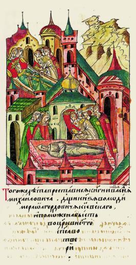 Keywords: Facial Chronicle - b.11, p.349 - Death of Vladimir Olgerdovich's daughter.gif В том же году п еставилась княгиня князя Василия ихайловича дочь князя Владими а Ольге довича Киев- ского и положена была в це кви святого Спаса в Тве и ____ Анастасия - муж Василий 1364 1426 князь кашинский и кснятинский с 1395 http //www runivers ru/bookreader/book480116/ page/242/mode/1up century 16 anonymous PD-Old Files uploaded by Shakko from various sources Facial Chronicle v 7 - Ostermanovskiy 2-y tom 1378-1424 Death in medieval miniatures Russia Vasiliy Mikhailovich of Kashin 1364-1426 1396 in Russia