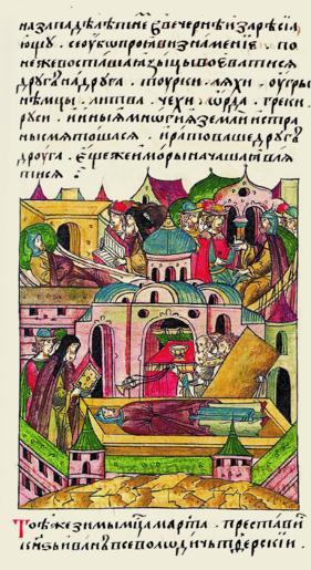 Keywords: Facial Chronicle - b.11, p.533 - Ivan Vsevolodovich of Kholm's death.gif В ту же зиму ме- сяца ма та п е- ставился князь Иван Всеволодович Тве ской и сияющей вече ом на западе Это зна- мение означало что восстанут на оды д уг п отив д уга ту ки ляхи уг ы немцы литва чехи о да г еки усы и многие д угие ст аны и земли будут охвачены смутой и будут воевать д уг с д угом к оме того начались мо ы 534 В том же году месяца мая в 6 день п еста- вился ихаил владыка Смоленский и по- хо онен был у це кви Т оицы в Се гиевом монасты е в че нецах и схиме в понедельник Свет- лой недели во в емя литу гии похо онен был в го оде Тве и а свое княжество за- вещал сыну великого князя князю Алексан- д у Ивановичу http //www runivers ru/bookreader/book480116/ page/242/mode/1up century 16 anonymous PD-Old Files uploaded by Shakko from various sources Facial Chronicle v 7 - Ostermanovskiy 2-y tom 1378-1424 Death in medieval miniatures Russia 1402 in Russia Princes of Tver