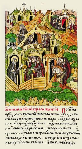 | Keywords: Facial Chronicle - b.11, p.063 - Sergius of Radonezh.gif О составлении обще- го жития Потом к святому Се гию в монасты ь п ишли из Константинопо- ля г еки посланные Филофеем пат иа хом Ца ег адским и пе е- дали ему благосло- вение от пат иа ха к ест и па аманд схиму и послание Блаженный же сказал им « е ошиблись ли вы ожет быть вы посланы к д угому едостоин я эти да ы получить от святейшего пат иа ха» Они же сп осили «Ты ли Се гий живущий в Радонеже » Он от- ветил «Я г ешный че нец Се гий» Они ответили «Тебя благо- словляет Филофей пат иа х Вселенский» Святой ничего не сказал После этого он оказал им большие почести и повелев им остаться в монасты е своем сам взял по- да ки и г амоту пат и- а ха и пешком пошел к блаженному мит о- политу Алексею в го од оскву Блаженный Се гий до поздней ста ости любивший т удиться никогда не ездил на коне но всег- да ходил пешком http //www runivers ru/bookreader/book480190/ page/7/mode/1up century 16 anonymous PD-Old Files uploaded by Shakko from various sources Facial Chronicle v 7 - Ostermanovskiy 2-y tom 1378-1424 Sergius of Radonezh in manuscripts |