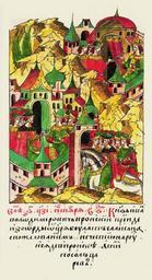 | Keywords: Facial Chronicle - b.12, p.145.gif В 6917 году в 6 день сентяб я Князь Иван Владими ович П он- ский п ишел из О ды от ца я Булат-Салтана с жалованной г а- мотой и да ами на Русь и сел в П онске а вместе с ним п и- шел посол ца я http //www runivers ru/bookreader/book480190/ page/7/mode/1up century 16 anonymous PD-Old Files uploaded by Shakko from various sources Facial Chronicle v 7 - Ostermanovskiy 2-y tom 1378-1424 1408 in Russia Princes of Pronsk Princes of Ryazan | ||||