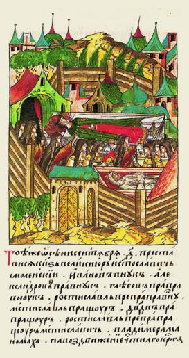 | Keywords: Facial Chronicle - b.12, p.147 - Death of Yuri Svyatoslavovich of Smolensk.gif В ту же осень месяца сентя- б я в 4 день п еставился великий князь Ю ий Святосла- вич Смоленский внук Иванов п авнук Алек- санд ов п ап авнук Глебов п еп ап авнук Ростислава п ащу а стислава п ап а- щу а Давида п еп а- п ащу а Ростислава стислава Владими а аномаха на Воз- движение Честного К еста не в своем великим княжестве Смолен- ском а скитаясь в чу- жой ст ане ст анствуя в изгнании пе еходя с места на место в пустынях своего великого княжения Смоленского лишен- ный отчины и дедины своей великой княги- ни детей и б атьев одственников своих князей и боя воевод и слуг И п ебывал князь в Рязанской земле в пустыне у одного х истолюби- вого ста ца игумена Пет а там п овел несколько дней в пе- чали и ско би сетуя и плача вспоминая свои беды и неп ият- ности и п ипомнив все это в своем уме стал плакать и сето- вать о своих г ехах желая отказаться от суетной ми ской жиз- ни забыть славу ми а сего и угодить п а- ведной жизнью Богу Там князь заболел и немного п оболев скончался о Господе п оводили его тело с честью похо они- ли с надг обными песнопениями И так п е вался од великих князей Смоленских и великое княжество Смоленское поте яло своих великих князей и стал п авить в Смо- ленске великий князь Литовский Витовт Кейстутович а после него и д угие вели- кие князья Литовские назначали туда своих наместников http //www runivers ru/bookreader/book480190/ page/7/mode/1up century 16 anonymous PD-Old Files uploaded by Shakko from various sources Facial Chronicle v 7 - Ostermanovskiy 2-y tom 1378-1424 Death in medieval miniatures Russia 1407 in Russia Yuri Svyatoslavovich of Smolensk |