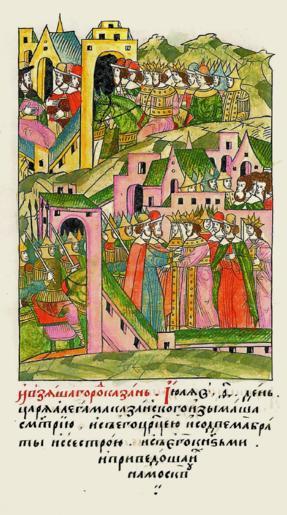| Keywords: Facial Chronicle - b.17, p. 066.gif И взяли го од Казань июля в 9 день и ца я Казанского Алегама пленили с его ма- те ью и ца ицей с двумя б атьями и сест ой и с его князьями и п ивели их в оскву http //www runivers ru/bookreader/book481263/ page/5/mode/1up 16th-century anonymous PD-Old Facial Chronicle v 8 - Shumilovskiy tom 1425; 1478-1533 Files uploaded by Shakko from various sources 1487 in Russia | ||||