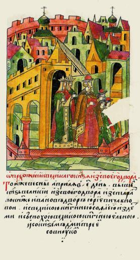 | Keywords: Facial Chronicle - b.17, p. 191.gif О пе еходе великого князя из своего дво а В ту же весну ап еля в 5 день пе ешел вели- кий князь из своего ста ого дво а в но- вый дво князя Ивана Ю ьевича вместе с великой княгиней Софьей с детьми и со снохой великой княгиней Еленой и с внуком князем Дмит ием; http //www runivers ru/bookreader/book481263/ page/5/mode/1up 16th-century anonymous PD-Old Facial Chronicle v 8 - Shumilovskiy tom 1425; 1478-1533 Files uploaded by Shakko from various sources Ivan III of Russia in miniature Sophia Palaiologina Elena Voloshanka of Moldavia Dmitriy Ivanovich the Grandson in miniature |