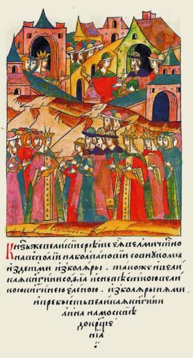 | Keywords: Facial Chronicle - b.17, p. 360.gif Князь же вели- кий вст етил ее с честью на Всполье на Болвано- ве с внуком детьми и с боя ами также и великая княгиня София с невесткой великой княгиней Еле- ной и с боя ынями И п обыла великая княгиня Анна в о- скве до К ещения http //sterligoff ru/books/Rus_Kniga 2018 pdf 16th-century anonymous PD-Old Facial Chronicle v 8 - Shumilovskiy tom 1425; 1478-1533 Files uploaded by Shakko from various sources Anna Vasilyevna Sophia Palaiologina Vasily III of Russia in miniature Elena Voloshanka of Moldavia |