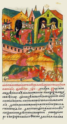 Keywords: Facial Chronicle - b.17, p. 362.gif Об опале великого кня- зя на своего сына князя Василия В 7006 году в декаб е по дьяволь- скому действу и на- важдению и по совету лихих людей азгневался великий князь Иван Васильевич на своего сына князя Василия и на свою жену великую княгиню Софью и в том гневе велел казнить боя ских детей Влади- ми а Елиза ова сына Гусева князя Ивана Палецкого Х уля и Поя ка Рунова б а- та и Щавья Ск ябина сына Т авина и вве- деного дьяка Федо а Ст омилова и Афана- сия Я опкина; казнили их на льду отсекли им головы декаб я в 27 день http //sterligoff ru/books/Rus_Kniga 2018 pdf 16th-century anonymous PD-Old Facial Chronicle v 8 - Shumilovskiy tom 1425; 1478-1533 Files uploaded by Shakko from various sources Ivan III of Russia in miniature Vasily III of Russia in miniature Sophia Palaiologina 1498 in Russia