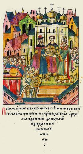 | Keywords: Facial Chronicle - b.17, p. 373 - Dmitriy the Grandson's coronation.gif и после молитвы велел мит ополит двум а химанд итам п и- нести к себе с аналоя ба мы и взяв их пе едал великому князю http //sterligoff ru/books/Rus_Kniga 2018 pdf 16th-century anonymous PD-Old Facial Chronicle v 8 - Shumilovskiy tom 1425; 1478-1533 Files uploaded by Shakko from various sources 1498 in Russia Dmitriy Ivanovich the Grandson in miniature Coronations in Russia Barmy | ||||