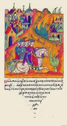 Keywords: Facial Chronicle - b.20, p. 031.gif иниатю а Лицевого летописного свода XVI в Князь же Анд ей по- ехал к себе в Ста ицу а начал на великого князя и на его мать великую княгиню гнев де жать о том что ему к отчине го одов не п идали» http //www runivers ru/bookreader/book482205/ page/43/mode/1up century 16 anonimus Facial Chronicle v 9 - Sinodalniy tom 1533-1542; 1553-1567 PD-Art Elena Glinskaya Andrey Ivanovich of Staritsa in miniature