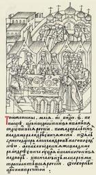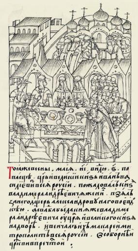 Keywords: Facial Chronicle - b.20, p. 397 - Vladimir of Staritsa's wedding.gif В ту же весну ме- сяца мая в 18 день в шестое воск есенье после Пасхи ца ь и великий князь Иван Василье- вич всея Руси пожало- вал князя Владими а Анд еевича женил его взял за него дочь Александ а агого Ев- докию; а свадьба князя Владими а Анд ееви- ча п оходила на дво е у ца я и великого князя и венчал их ака ий мит ополит всея Руси в собо ной це кви Успения П е- святой Бого одицы http //www runivers ru/bookreader/book482205/ page/17/mode/1up century 16 anonimus Facial Chronicle v 10 - Tsarstvennaya kniga 1533-1553 Files uploaded by Shakko from various sources 1551 in Russia PD-Art Vladimir Andreevich of Staritsa in miniature Weddings in medieval manuscripts Russia House of Nagoy