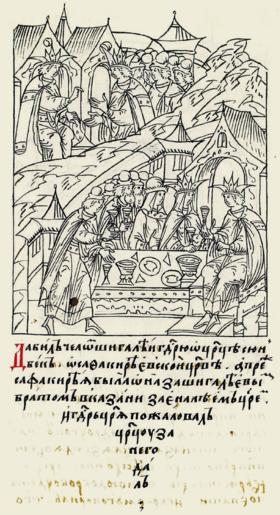 | Keywords: Facial Chronicle - b.21, p. 113.gif иниатю а Лицевого летописного свода XVI в да бил челом Шигалей госуда ю о ца ице Сююнбеке ца я Сафа- Ки ея а до Сафа-Ки- ея была она за ца ем Еналеем б атом Ши- галея в Казани а госу- да ь ца я пожаловал ца ицу за него отдал http //www runivers ru/bookreader/book482205/ page/43/mode/1up century 16 anonimus Facial Chronicle v 10 - Tsarstvennaya kniga 1533-1553 Weddings in medieval manuscripts Russia PD-Art | ||||