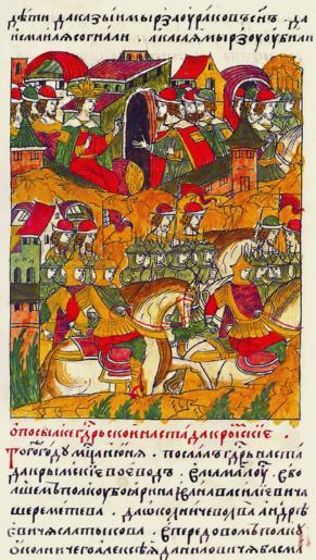 Keywords: Facial Chronicle - b.22, p. 187.gif Лицевой летописный свод О посылке госуда евой на стада К ымские В том же году в месяце июне послал госуда ь на стада к ымские воевод в амаилуе в большом полку боя ина Ивана Васильевича Ше еметева да окольничего Льва Анд еепича Салтыкова в пе едовом полку окольничего Алексея Даниловича Басманова http //www runivers ru/bookreader/book482205/ page/17/mode/1up century 16 anonimus Facial Chronicle v 9 - Sinodalniy tom 1533-1542; 1553-1567 Files uploaded by Shakko from various sources 1555 in Russia House of Saltykov House of Sheremetev House of Basmanov PD-Art