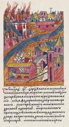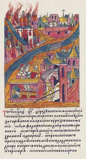 Keywords: Facial Chronicle - b.23, p. 244.jpg Лицевой летописный свод В том же месяце в 17 день в с еду на память святой великомученицы а ины в седьмом часу дня заго елся на А бате у це кви Риз Положения дво князя Федо а Пожа ского И пого ело многое множество х амов и дво ов от Успенского ов ага подле отк ытого места до д овяного дво а и бе ег весь до це кви святого Клементия в Че то ье и по Семчинское сельцо и до це кви П ечистой на огилицах и А бат весь и за А бат по овинский монасты ь А ца ица и великая княгиня Анастасия в то в емя была больна и ца ь и великий князь великую княгиню п оводил в свое село в Коломенское с большим т удом потому что болезнь ее была очень тяжела http //www runivers ru/bookreader/book482205/ page/17/mode/1up century 16 anonimus Facial Chronicle v 9 - Sinodalniy tom 1533-1542; 1553-1567 Files uploaded by Shakko from various sources PD-Art Fires in Moscow Anastasia Romanovna