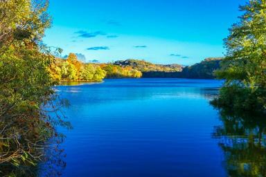 Keywords: fall lake blue sky water scenic park outdoor forest leaves foliage