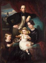 Keywords: Familie von Cramm vor Schloss Oelber.jpg Familie von Cramm vor Schloss Oelber A portrait of the von Cramm family with the family home Schloss Oelber in the distance Oil on canvas 174 x 129 cm According to the inscription that was transcribed from the original canvas the sitters are Adalbert von Cramm 1818-1851 his wife Mechthilde von Cramm née Countess Veltheim 1825-1874 and their children Edgar 1846-1909 and Herta born 1847 Edgar was the grandfather of w Gottfried von Cramm 1909-1976 the well-known tennis player http //www bonhams com/ Bonhams ~ 1850 anonymous PD-old Images from Bonhams Family portraits 1850s paintings Biedermeier portrait paintings Schloss Oelber Armchairs in portrait paintings Cramm family |