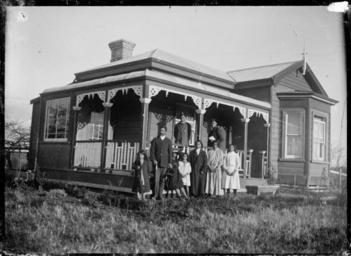 | Keywords: blackandwhite monochrome outdoor building architecture black and white Unidentified family group standing on the lawn in front of a single-storied wooden villa. The house has a corrugated iron roof, a chimney, bay window and a verandah on two sides. Photograph taken by William A Price ca 1910. Quantity: 1 b&w original negative(s). Physical Description: Dry plate glass negative 4.75 x 6.5 inches Family group standing on lawn in front of a villa. Price, William Archer, 1866-1948 :Collection of post card negatives. Ref: 1/2-001223-G. Alexander Turnbull Library, Wellington, New Zealand. natlib.govt.nz/records/23040448 Unidentified family group standing on the lawn in front of a single-storied wooden villa. The house has a corrugated iron roof, a chimney, bay window and a verandah on two sides. Photograph taken by William A Price ca 1910. Quantity: 1 b&w original negative(s). Physical Description: Dry plate glass negative 4.75 x 6.5 inches Family group standing on lawn in front of a villa. Price, William Archer, 1866-1948 :Collection of post card negatives. Ref: 1/2-001223-G. Alexander Turnbull Library, Wellington, New Zealand. natlib.govt.nz/records/23040448 |