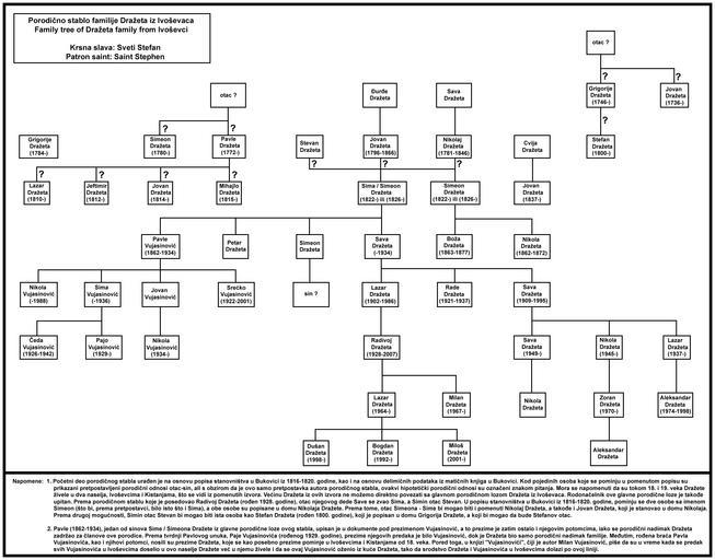 | Keywords: Family tree drazeta ivosevci.png Porodično stablo familije Dražeta iz Ivoševaca / Family tree of Dražeta family from Ivoševci Ja sam autor / I am author Family trees of Serbia Family trees of Croatia 2013-07-22 own assumed РД~commonswiki Cc-zero Literatura / Sources 1 Matične knjige u Bukovici delimični podaci 2 Popis stanovništva u Bukovici iz 1816-1820 godine 3 Porodično stablo koje je izradio Radivoj Dražeta rođen 1928 godine 4 Knjiga Vujasinovići autor Milan Vujasinović 5 Knjiga Antroponimija Bukovice autor Živko Bjelanović Split 1988 |