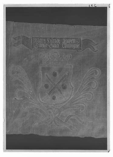 | Keywords: Fana för Sätila socken i Marks härad - Livrustkammaren - 34672-negative.tif Duk av enkel blå linnelärft 2 vertikala våder sammansydda med en smal fällsöm Stad i vertikala ytterkanten Fållen i över och underkanten lagd åt dukens utsida Dekor målad lika på båda sidor I mitten i gult en med öppen krona krönt sköld Nedtill innefattad av två korsade svärd med vita klingor och gula fästen följda av fyra i vinklar ställda vita kulor På det vita inskriptionsbandet text i svartSättilla Giäld Compagnie på insidan Mark härad Wapen // Sättilla Compagnie Fäst med 1 rad sexuddiga tennlickor på ett blått band Bandet har ursprungligen fortsatt 330 mm ned på stången <br/>Stång av trä avsågad brunmålad Holk av mässing original caption 1710 wood Färg brun material trä - brass size mm 98 holk size mm 2445 stång total size mm 1460 size mm 1400 size mm 670 våd yttre size mm 735 våd inre LRK place of origin original filename LN_B01394_004274 53591 inventory number LRK 17037 34672 CC0 Fana för Sätila socken i Marks härad - Livrustkammaren - 34672 tif <gallery caption Different images of same object > File Fana för Sätila socken i Marks härad - Livrustkammaren - 26110 tif </gallery> |