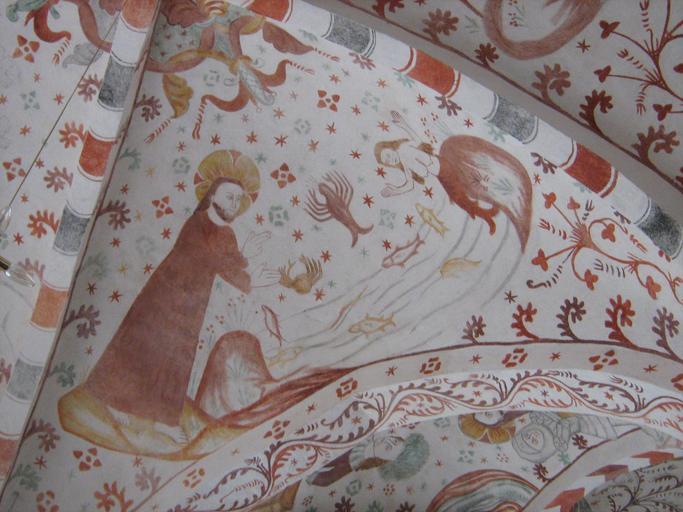 Keywords: Fanefjord God sea creatures.JPG en Fanefjord Church Møn Denmark Fresco of God creating sea creatures including mermaid own Ipigott 2009-09-09 Creation in frescos Møn Frescos in Fanefjord Church