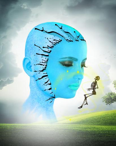 Keywords: fantasy fairy magic skeleton clouds spooky scary meadow grass woman face girl blue glow glowing cloudy