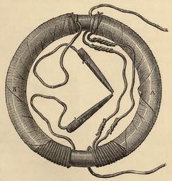 | Keywords: Faradays transformer.png Drawing of the first transformer built by British scientist Michael Faraday in the 1830s It consisted of an iron ring with two windings of insulated wire around it Faraday attached one winding to a sensitive galvanometer When he touched the other winding to a single cell battery the winding created a changing magnetic field in the ring which induced a momentary current in the second winding due to electromagnetic induction which was registered by the galvanometer <br><br> Although this device looks remarkably like a modern transformer Faraday is not considered the inventor of the transformer He only applied individual pulses of current to his device not the alternating current that allows modern transformers to work continuously More importantly the device had the same number of turns on both windings Faraday did not discover the principle that makes transformers useful - that it can be used to transform the voltage up or down by using different numbers of turns in the seconday than in the primary winding Downloaded 2009-08-06 from Frederick Bedell 1868-1958 1896 http //books google com/books id 4SwJAQAAIAAJ pg PA288 The Principles of the Transformer The MacMillan Co New York p 288 fig 162 <br> High resolution version from Friedrich Uppenborn 1859-1907 1889 http //www archive org/details/historyoftransfo00upperich History of the Transformer p 3 fig 2 1896 Author Public domain - published at least 114 years ago PD-old Historic transformers Michael Faraday |