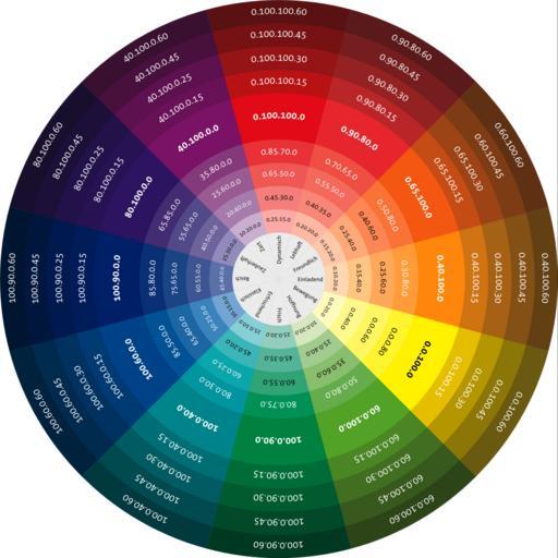 Keywords: Farbkreis mit CMYK-Werten.png Farbkreis mit CMYK-Werten Color wheel with CMYK values Own 2006-09-21 SYS64738 Public Domain Colorwheels CMYK Computer graphic color codes