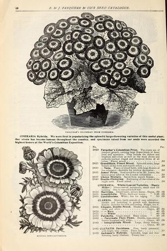 Keywords: Farquhar's catalogue of seeds 1901 (15963419583).jpg R 5r»/ FARQUHAR CO 'S SEED CATALOGUE <br> FARQUHAR'S COLUMBIAN PRIZB CINERARIA <br> CINERARIA liybrida We were first in popularizing the splendid large-flowering varieties of this useful plant <br> Our strain has become famous throughout the country and specimens raised from our seeds were accorded the <br> highest honors at the World's Columbian Exposition <br> ANNUAL CHRYSANTHEMUM <br> No <br> 2820 <br> 2825 <br> Pkt <br> Farquhar's Columbian Prize The plants are of <br> compact growth carrying large flower-heads of finest <br> form and substance They include the richest and <br> brightest self-colors as well as the most showy and <br> perfectly marked ringed and margined forms of all <br> colors Finest mixed <br> Grandiflora Finest Mixed Splendid strain large <br> flowers of fine form and superb colors <br> 2830 ” Nana Plants of dwarf habit with large flowers of <br> fine substance ; desirable for window decoration <br> 2835 James' Prize Seed saved for us by Mr James the <br> famous prize taker at the London exhibitions <br> 2837 Choice Mixture Saved from superb flowers <br> 2840 Double Flowering Embracing all the colors of the <br> single sorts Finest mixed <br> CINERARIA White-Leaved Varieties Dusty <br> Miller Silvery-leaved perennials much used for <br> bedding One to one-and-a-half feet <br> 2850 Maritima Dwarf habit ; silvery leaves Ounce 50 05 <br> 2855 Acanthifolia White finelv-cut leaves 1 25 05 <br> 2860 Candidissima White; fine for edging 50 05 <br> CLARKIA Showy hardy annuals of easy cultivation ; <br> slender and branching in growth with handsome <br> flowers ; desirable for beds and cutting Height one ft <br> 2865 Elegans Double Mixed Shades of rose crimson <br> violet and white Ounce 40 05 <br> 2870 Rose 40 05 <br> 2875 White 40 05 <br> 2880 Pulchella Single mixed Many colors 40 05 <br> 2882 ” /larginata Flore Pleno Double rose-colored <br> flowers 'margined with white Ounce 40 05 <br> 2883 ” Integripetala Mixed Large showy flowers <br> ¢ Ounce 40 05 <br> 2885 CLEI1ATIS Davidiana Fine hardy perennial <br> with bright blue lowers Three feet 10 <br> 2895 Jackman's Hybrids Splendid large and free- <br> flowering hardy climbers Twenty feet 1§ 42284039 133538 66475 Text http //www biodiversitylibrary org/page/42284039 1901 10 5962/bhl title 66475 Henry G Gilbert Nursery and Seed Trade Catalog Collection ; R J Farquhar Company NameFound Acanthifolia NameFound Candidissima NameConfirmed Candidissima NameBankID 4102668 NameFound Chrysanthemum NameConfirmed Chrysanthemum EOLID 38388 NameBankID 2657422 NameFound CINERARIA NameConfirmed Cineraria EOLID 6258313 NameBankID 1674869 NameFound CINERARIA NameConfirmed Cineraria EOLID 6258313 NameBankID 4894724 NameFound Clarkia NameConfirmed Clarkia Pursh EOLID 38068 NameFound Davidiana NameFound Elegans NameConfirmed Elegans NameBankID 5116399 NameFound Grandiflora NameFound Integripetala NameFound Maritima NameFound Pulchella NameConfirmed PULCHELLA EOLID 6016096 NameBankID 4937452 Biodiversity Heritage Library Farquhar's catalogue of seeds 1901 plants bulbs fertilizers tools sundries / Garden Stories Bedding plants Boston Catalogs Equipment and supplies Flowers Gardening Massachusetts Nurseries Horticulture Nursery stock Perennials R J Farquhar Company Seeds U S Department of Agriculture National Agricultural Library bhl page 42284039 dc identifier http //biodiversitylibrary org/page/42284039 bhlGardenStories Cineraria Chrysanthemum BHLinbloom nurseries horticulture r j farquhar company u s department of agriculture national agricultural library bhlgardenstories bhlinbloom Information field Flickr posted date ISOdate 2015-02-19 Cineraria hybrida Petasites hybridus CC-BY-2 0 BioDivLibrary https //flickr com/photos/61021753 N02/15963419583 2015-08-24 02 54 02 cc-by-2 0 PD-old-70-1923 Bedding plants Petasites hybridus Farquhar's catalogue of seeds 1901 Photos uploaded from Flickr by Fæ using a script