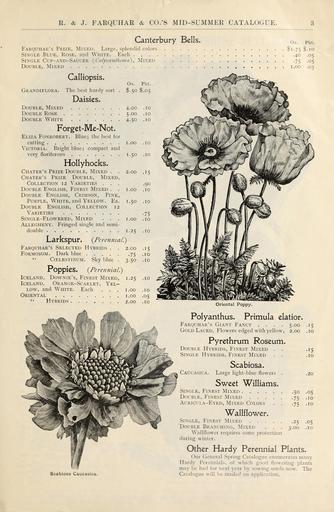 | Keywords: Farquhar's mid-summer catalogue (16991398271).jpg R J FARQUHAR CO 'S MID-SUMMER CATALOGUE <br> Canterbury Bells <br> Farquhar's Prize Mixed Large splendid colors <br> Single Blue Rose and White Each <br> Single Cup-and-Saucer Calycanihema Mixed <br> Double Mixed <br> Oz Pkt <br> 1 75 10 <br> 40 05 <br> ˘75 -05 <br> i oo 05 <br> Calliopsis <br> Oz Pkt <br> 50 05 <br> Grandiflora The best hardy sort <br> Daisies <br> Double Mixed 4 C0 10 <br> Double Rose 5 00 10 <br> Double White 4 50 10 <br> Forget-Me-Not <br> Eliza Fonrobert Blue; the best for <br> cutting 1 00 10 <br> Victoria Bright blue; compact and <br> very floriferous ˘ <br> Hollyhocks <br> Chater's Prize Double Mixed <br> Chater's Prize Double Mixed <br> Collection 12 Varieties <br> Double English Finest Mixed <br> Double English Crimson Pink <br> Purple W hite and Yellow Ea <br> Double English Collection 12 <br> Varieties <br> Single-Flowered Mixed <br> Allegheny Fringed single and semi- <br> double 1 25 <br> Larkspur Ferenmal <br> Farquhar's Selected Hybrids 2 00 <br> FoRMOSUM Dark blue 75 <br> Ccelestinum Sky blue 3 50 <br> Poppies Perennial <br> Iceland Downie's Finest Mixed 1 25 <br> Iceland Orange-Scarlet Yel- <br> low and White Each 1 00 <br> Oriental i oo <br> - Hybrids 2 00 <br> 1 50 <br> 2 00 <br> i oo <br> 1 50 <br> i oo <br> Oriental Poppy <br> Polyanthus Primula elatior <br> Farquhar's Giant Fancy 5 00 <br> Gold Laced Flowers edged with yellow 2 00 <br> Pyrethrum Roseum <br> Double Hybrids Finest Mixed <br> Single Hybrids Finest Mixed <br> Scabiosa <br> Caucasica Large light -blue flowers <br> Sweet Williams <br> 15 <br> 10 <br> ˘IS <br> 10 <br> 20 <br> – 50 05 <br> – 75 -lo <br> – 75 -lo <br> ˘25 <br> 00 <br> ˘05 <br> 10 <br> Scabiosa Caucasica <br> Single Finest Mixed <br> Double Finest Mixed <br> Auricula-Eyed Mixed Colors <br> Wallflower <br> Single Finest Mixed <br> Double Branching Mixed <br> Wallflower requires some protection <br> during winter <br> Other Hardy Perennial Plants <br> Our General Spring Catalogue enumerates many <br> Hardy Perennials of which good flowering plants <br> may be had for next year by sowing seeds now The <br> Catalogue will be mailed on application 43902027 149998 78553 Page 3 Text http //www biodiversitylibrary org/page/43902027 1902 10 5962/bhl title 78553 Henry G Gilbert Nursery and Seed Trade Catalog Collection ; R J Farquhar Company NameFound Calliopsis NameConfirmed Calliopsis EOLID 2748143 NameBankID 4099619 NameFound Calycanihema NameFound Caucasica NameConfirmed Caucasica EOLID 9101655 NameBankID 4105838 NameFound Ccelestinum NameFound Polyanthus NameConfirmed Polyanthus NameBankID 3485302 NameFound Primula elatior NameConfirmed Primula elatior EOLID 483957 NameBankID 2669987 NameFound Pyrethrum NameConfirmed Pyrethrum Medik EOLID 2879753 NameBankID 8777274 NameFound Scabiosa NameConfirmed Scabiosa 'Simon Greaves' EOLID 49101 NameFound Victoria NameConfirmed Victoria EOLID 34123 NameBankID 897688 Biodiversity Heritage Library Farquhar's mid-summer catalogue 1902 Bedding plants Boston Catalogs Equipment and supplies Flowers Gardening Massachusetts Nurseries Horticulture Nursery stock Perennials R J Farquhar Company Seeds U S Department of Agriculture National Agricultural Library bhl page 43902027 dc identifier http //biodiversitylibrary org/page/43902027 bhlGardenStories Oriental Poppy Scabiosa nurseries horticulture r j farquhar company u s department of agriculture national agricultural library bhlgardenstories oriental poppy Information field Flickr posted date ISOdate 2015-03-31 CC-BY-2 0 BioDivLibrary https //flickr com/photos/61021753 N02/16991398271 2015-08-23 22 06 50 cc-by-2 0 PD-old-70-1923 Farquhar's mid-summer catalogue Photos uploaded from Flickr by Fæ using a script |