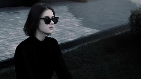 Keywords: fashionable girl in glasses in the black pants shirt street glamour girl four of a kind model art fashion beauty modern makeup
